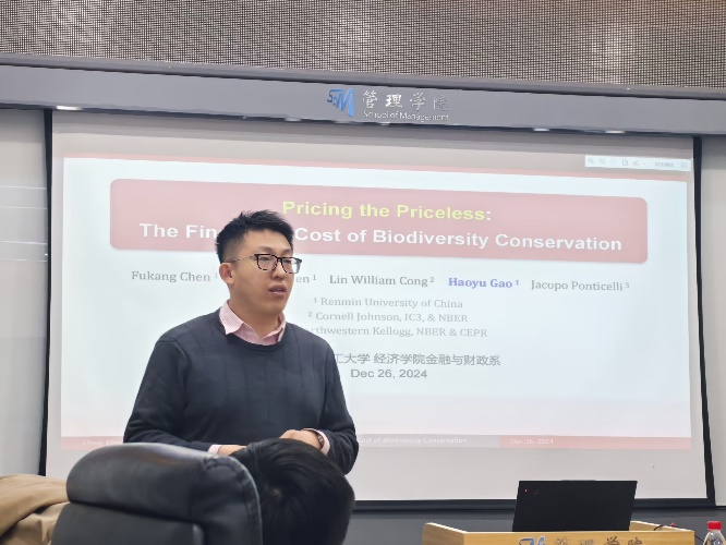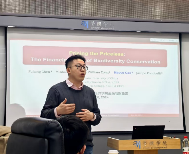 2024年12月26日上午,北京理工大学经济学院在中关村校区主楼317成功举办“经工讲堂”系列学术讲座。讲座邀请中国人民大学吴玉章特聘教授、财政金融学院货币金融系副主任高昊宇老师担任主讲人,主题为“Pricing the Priceless: The FinancingCost of Biodiversity Conservation”。此次讲座由经济学院金融与财政系承办,李奕助理教授主持。