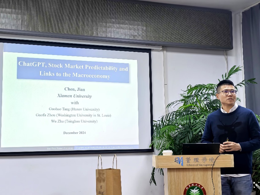 2024年12月4日下午,北京理工大学经济学院在中关村校区主楼成功举办学术讲座。讲座特邀厦门大学经济学院与邹至庄经济研究院教授、博士生导师陈坚担任主讲人,主题为“ChatGPT, Stock Market Predictabilityand Links to the Macroeconomy”。此次讲座由经济学院金融与财政系承办,李奕助理教授主持。
