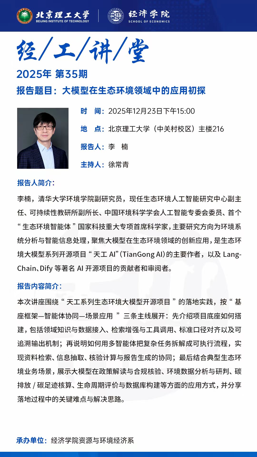 【经工讲堂2025年第35期】12-23 清华大学李楠副研究员:大模型在生态环境领域中的应用初探