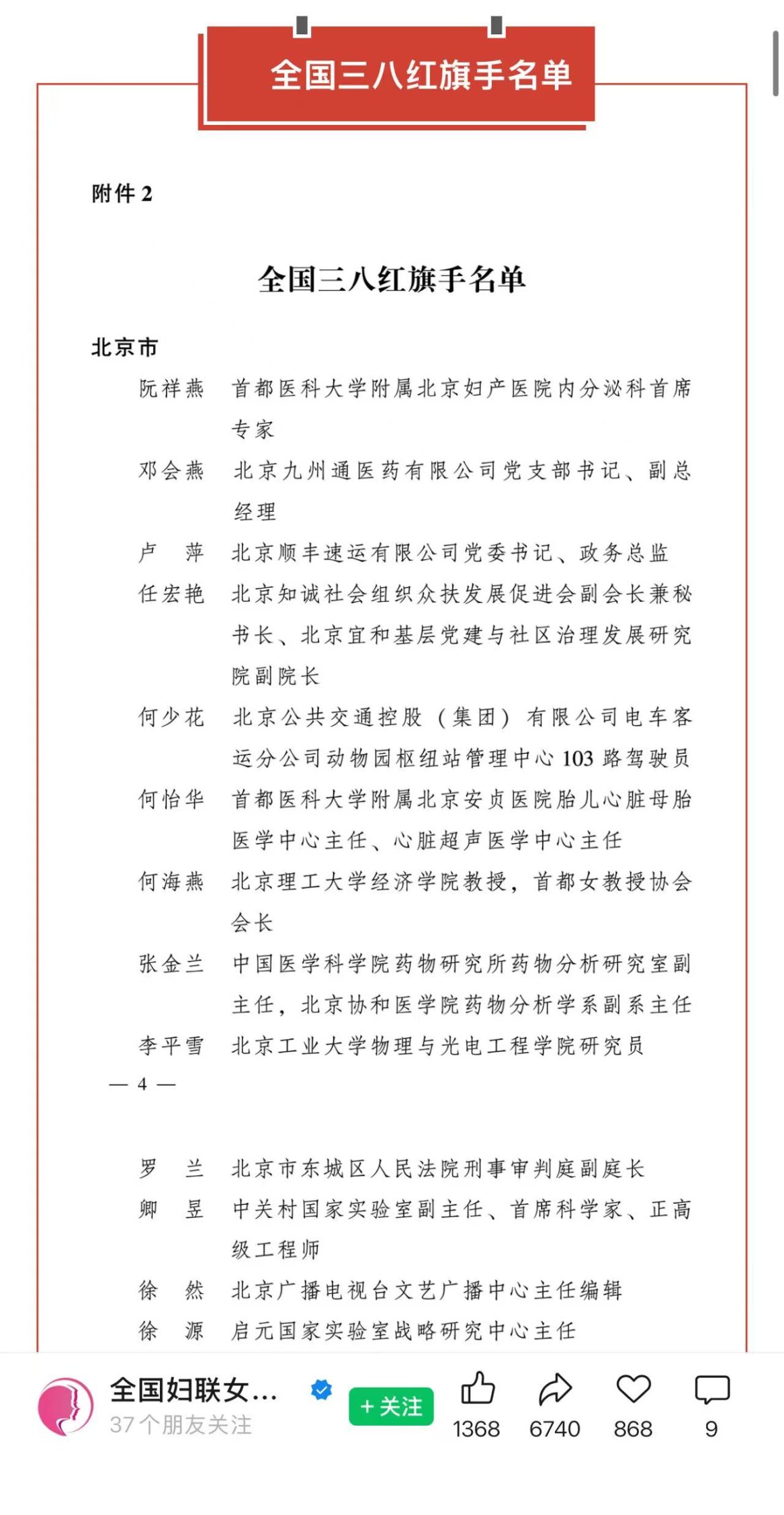 为表彰先进、树立榜样, 充分发挥先进典型和模范人物示范作用, 全国妇联决定, 授予阮祥燕等598人全国三八红旗手称号。我院何海燕教授获此殊荣。